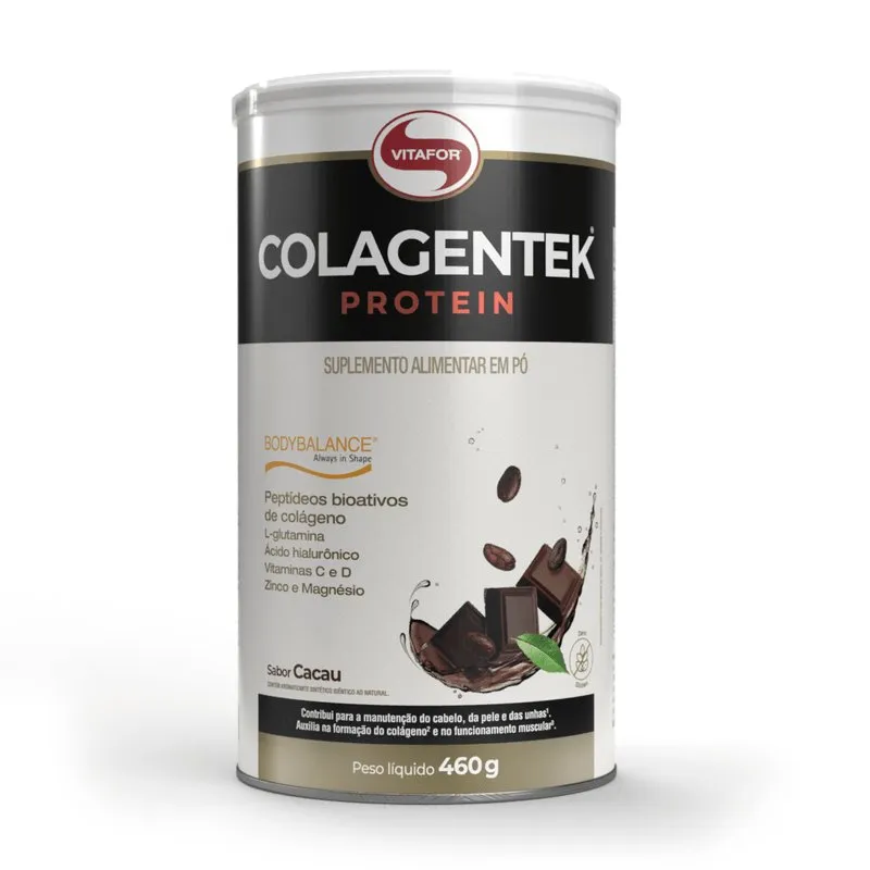 Colagentek Protein - Bodybalance - 460g Cacau - VITAFOR Os músculos são essenciais para tudo o que se faz no dia a dia. Desde manter a postura, andar, realizar movimentos simples como digitar... são peças fundamentais para manter o organismo em funcionamento¹.???Mas, para que funcionem da forma certa, é preciso manter a saúde muscular em dia. Não é segredo que, para isso, é recomendado a prática de atividades físicas regularmente e uma alimentação equilibrada. Além disso, a suplementação pode ser uma grande aliada².?A tecnologia BODYBALANCE® se mostrou eficiente não só no ganho de massa muscular, mas também podendo auxiliar no processo de perda de gordura². Essa tecnologia consiste na proteína derivada do colágeno hidrolisado, com comprovação clínica e científica associando diversos benefícios³.?????????Além do colágeno hidrolisado, COLAGENTEK® PROTEIN conta com glutamina, ácido hialurônico, vitaminas C e D, magnésio e zinco.??? Adicione à sua rotina uma opção prática e saborosa!???